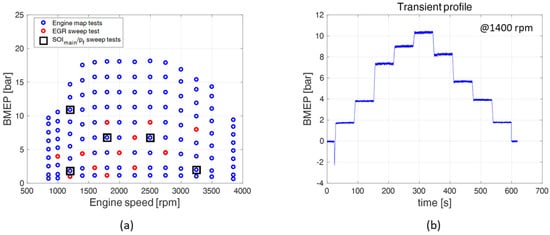 The dataset includes different load ramps for several engine speed conditions, with and without EGR. Two different load-variation strategies were considered, i.e., variations from 0% to 60–70% of maximum load with intermediate steps (hat-shaped ramp) and variations from 0% to 60% of maximum load with different ramp durations.