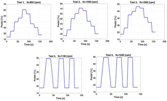 Time histories of the accelerator-pedal position for the different ramps acquired at different speeds for the 11L diesel engine.