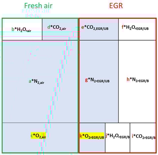 The EGR/B contribution includes CO2, H2O and N2 moles derived from a stoichiometric combustion of dry air with fuel, according to the following reaction [28]: