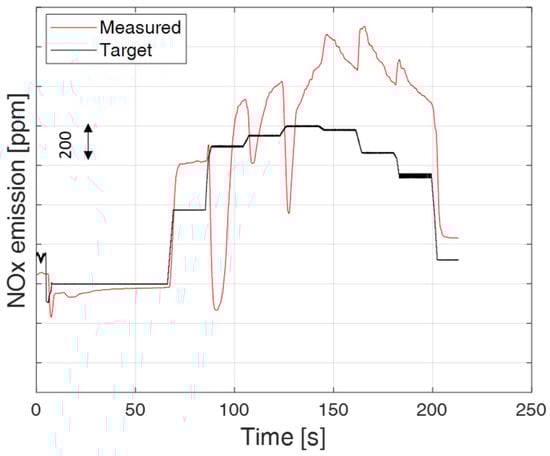 The capability of the NOx model to increase/reduce the NOx emission levels of a required target along these ramps was evaluated in [9]. In this paper, the ramps were reprocessed by means of the combustion model by providing the intake O2 level derived from the newly developed procedure as input, instead of the original one, which had been derived from the ECU sub-models. In other words, the ramps were reprocessed using the combustion model as a “virtual sensor”, i.e., by providing the values of the engine state variables as input, as well as of the control variables that had been acquired during the original tests performed during the IMPERIUM project, except for the intake O2 concentration. This allowed us to evaluate the impact of the intake O2 concentration on the accuracy of the NOx model under transient operating conditions in order to further assess its validation.