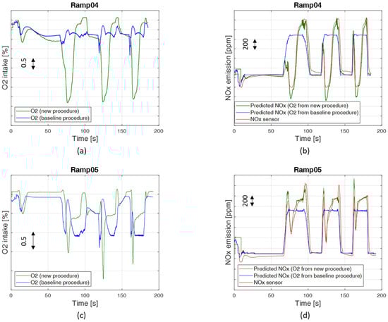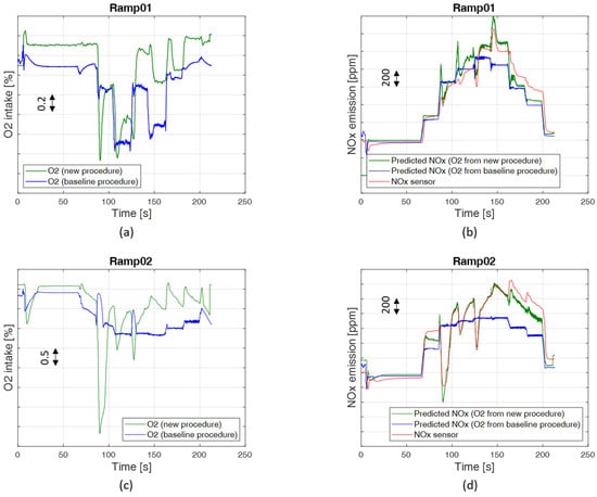 Instead, Figure 11b,d and Figure 12b,d show a comparison, for the different ramp tests, between the NOx values predicted by the model when using the intake oxygen concentration from the baseline procedure (blue lines), the NOx values predicted by the model when using the intake oxygen concentration derived from the new procedure (green lines) and the values of the NOx emissions that were measured by the NOx sensor (red lines).