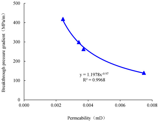 (6) We identified the relationship between permeability and breakthrough pressure and breakthrough pressure differences, fit the experimental results, and evaluated the sealing ability of the caprock.