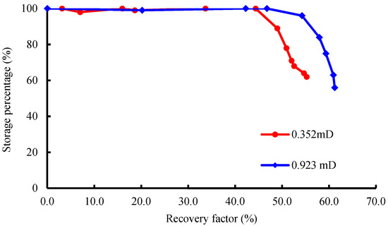 - At the same storage percentage, the recovery factor of crude oil is higher in a core with higher permeability. The storage percentage decreases with an increase in the recovery factor, and low-permeability reservoirs are more prone to store CO2. Compared with water-gas-altering injection, continuous injection is more conducive to the geological storage of carbon dioxide.