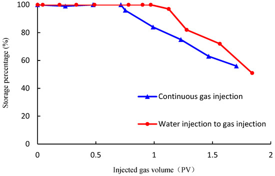 In the process of continuous gas injection, the gas injected with about 0.7 PV breaks through, and the gas storage percentage decreases rapidly. When the injected gas is about 1.2 PV, the retention rate decreases slightly; the injection is altered from water injection to gas injection when the water cut achieves 90%, and the initial change of storage percentage is small. However, when the gas injection is 0.9 PV, gas is produced, gas channeling is rapid, and the storage percentage decreases faster than during continuous gas injection (Figure 7). The analysis suggests that the water film in some core pores reduces the pore space after the initial water injection following the switch to gas flooding, so that the storage percentage decreases faster after gas channeling than continuous gas injection. It shows that continuous gas injection is more conducive to the geological sequestration of carbon dioxide.