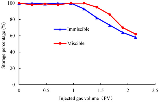 - Under the same injection PV, the storage percentage of the carbon dioxide miscible phase is greater than that of the immiscible phase, indicating that the greater the pressure, the more conducive it is to the geological storage of carbon dioxide. At the same gas–oil ratio, the recovery factor of miscible crude oil is greater than that of immiscible crude oil.
