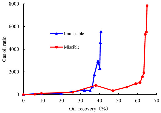 The higher the injection pressure, the more carbon dioxide will be dissolved into the crude oil. The better the miscibility between carbon dioxide and crude oil, the higher the recovery factor of crude oil and the greater the storage factor. When the injection volume is greater than 0.95 PV, the carbon dioxide storage decreases after the gas breakthrough. Under the same injection PV, the burial rate of the carbon dioxide miscible phase is greater than that of the immiscible phase (Figure 8), and greater injection pressures result in enhanced geological sequestration under the miscible injection scenario. At the same gas–oil ratio, the recovery factor of miscible crude oil is greater than that of immiscible crude oil. The lower the pressure, the lower the miscibility degree of carbon dioxide and crude oil. The more serious the fingering phenomenon is in the process of gas flooding, the easier it is to produce injected gas. The immiscible gas–oil ratio is greater than the miscible gas–oil ratio (Figure 9), thus affecting the storage efficiency of carbon dioxide.