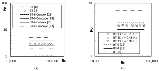 The power number (Po = P/(N3D5ρ)) for the BT-33 impeller is Po = 2.83 and is comparable with the power number for the BT-4 (convex) (Po = 2.66) and BT-6 (concave) Po = 2.6. The steady power number for the BT-6 (convex, Po = 3.78) was about 31% higher than for the BT-33 and 48% higher than BT-4 (concave, Po = 1.91). The highest value of the power number was obtained for Rushton’s turbine (Po = 4.9) [8]. Figure 3b presents the power of the unsteady mixing. For unsteady mixing, an increase in the power demand is observed. For the BT-33 impeller, the unsteady mixing power is about 36% higher and amounts to Po = 3.86. Similar relationships were obtained for the remaining impellers [23,24]. No effect of the oscillation frequency on the mixing power of homogeneous systems in the range f = 0.23–0.92 Hz was observed. This indicates that the drag forces dominate the inertia forces.
