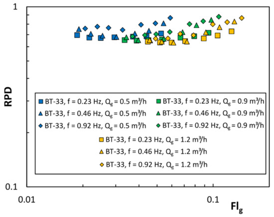 Figure 4 shows the dependence of the relative power demand, RPD, on the gas flow number for the BT-33 impeller and unsteady mixing. Relative power is defined as the ratio of the mixing power in the gassed system, Pg, to the mixing power in the system without gas Pu (RPD = Pg/Pu), and the gas flow number, , is defined by the formula: