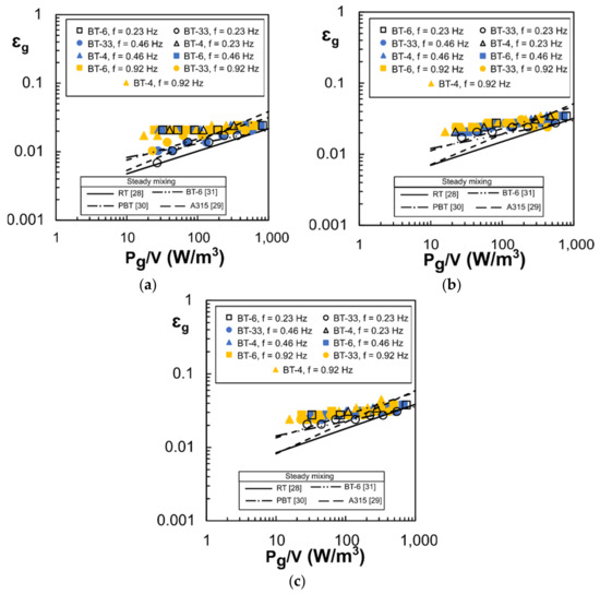 The gas hold-up for unsteady mixing increases with the mixing power, as well as the gas flow rate Qg. The lowest hold-up values were observed for the BT-33 impeller, while for the BT-4 and BT-6 impellers they were comparable. A slight influence of the oscillation frequency was also observed, with its increase, a slight increase in the gas hold-up is observed. Moreover, as the amount of gas increased, the differences in the gas hold-up between the impellers decreased, with the lowest values observed for the BT-33 impeller. Figure 5 also compares the results obtained for the unsteady mixing with the results of the gas hold-up for the steady mixing and the A315, PBT, RT, and BT-6 impellers [28,29,30,31]. The obtained results show that for the unsteady mixing the rate of gas hold-up is greater than for the steady mixing. Moreover, as the energy input per unit volume increases, the differences in the gas hold-up decrease, and above 1000 W/m3, for the analyzed impellers, the gas hold-up for unsteady mixing is lower than for the steady mixing in a vessel equipped with the Rushton turbine and the BT-6 impeller [28,29,30,31]. In the case of the A315 and PBT impellers, the advantage of unsteady mixing disappears above Pg/V = 700 W/m3.