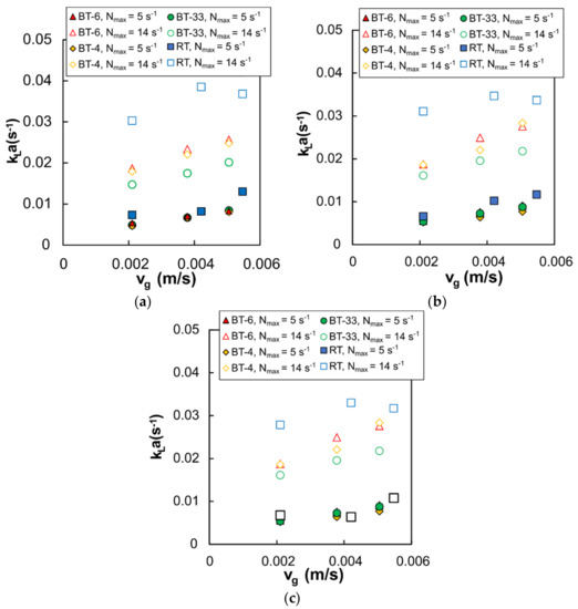 Relation between volumetric mass transfer coefficient kLa and superficial gas velocity vg for BT-33, BT-4, BT-6, and RT impellers: (a) f = 0.23 Hz, (b) f = 0.46 Hz, (c) f = 0.92 Hz.