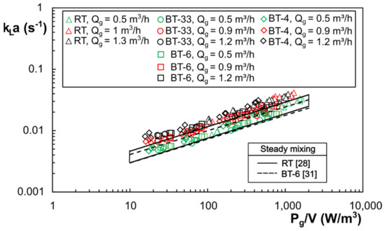 Figure 6 shows the dependence of kLa on the superficial gas flow velocity vg for the analyzed impellers and different oscillation frequencies, as well as maximum impeller speed Nmax. For Nmax = 5 1/s, the values of the volumetric mass transfer coefficient kLa were comparable for all impellers, regardless of the gas flow velocity vg. Larger differences are observed for Nmax = 14 1/s. The highest efficiency of mass transfer is observed for the RT impeller and the lowest for the BT-33 impeller. With an increase in the oscillation frequency, it was observed that the advantage of Rushton’s turbine decreased with increasing gas velocity vg. This suggests that for gas flow velocities greater than vg = 0.0058 m/s or greater oscillation frequency, the impellers with ellipsoidal blades (BT-4 or BT-6) will show higher mass transfer efficiency. The differences between the impellers also result from the fact that at vg = const each impeller has a different gassed mixing power and RPD.