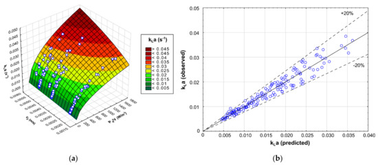 Verification of Equation (12): (a) experimental data and model, (b) predicted and observed values of kLa.