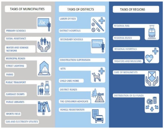 There are three types of municipalities: urban, which comprise towns; rural, which comprise the countryside and urban–rural, which comprise towns with the surrounding countryside. Some of the urban municipalities have a specific status: one administrative center performs the tasks of both the municipality and the district at the same time. These are called cities with district rights. These units do not form a separate level of local government and are still classified as municipalities. The tasks of local government are presented in Figure 1.
