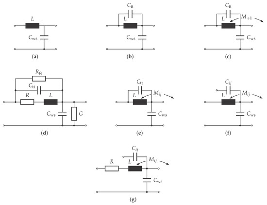 From the circuits shown in Figure 1, the single-turn model shown in Figure 5 is derived, which incorporates the following aspects: