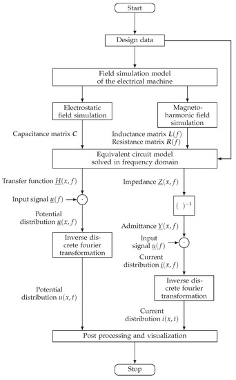 This section is separated in accordance to the flowchart of the complete methodology in Figure 2 and describes the methodology in detail. Briefly, the methodology consists of the following key aspects: two different field simulations are executed. Those provide input parameters for the equivalent circuit model, which is solved in the frequency domain, and the result is multiplied with an input signal. This leads to the potential distribution of the winding in the frequency domain. After an inverse Fourier transformation, the potential distribution can be visualized and processed further.