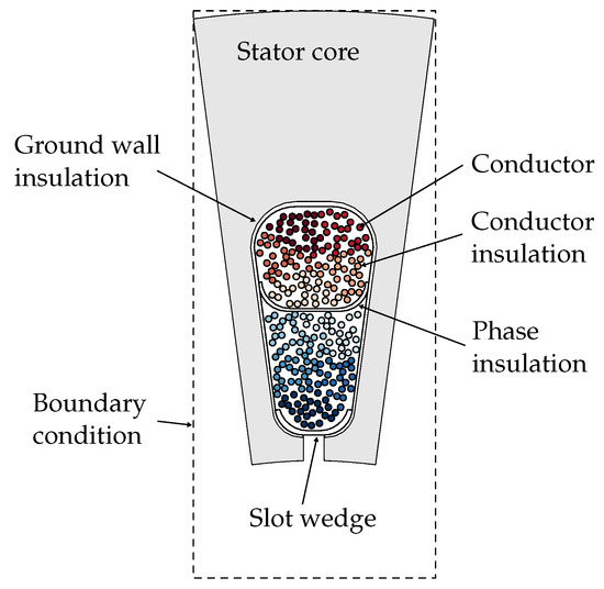 The electrostatic field simulation is carried out for the two-dimensional model shown in Figure 3. Material properties are assigned in accordance with data provided by manufacturer’s data sheets. In this case, the ground wall insulation , the phase insulation , the turn insulation , and the slot wedges have different relative permittivities . A turn consists of 24 parallel strands and related strands are highlighted in the same color. As there is no conductivity concept in electrostatics, all edges of the stator core and the individual conductor are imposed with equipotential boundary conditions. The model shown in Figure 3 forms the smallest repeating entity for the electrostatic field simulation.