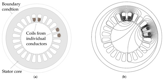 The magneto-harmonic field simulation is carried the on the two-dimensional model shown in Figure 4. Materials are assigned in accordance with the manufacturer’s data sheets; the specific values are given in Table 2. As shown below, the magneto-harmonic field simulation does not consider the effects of insulation materials. The insulation material is thus ignored and therefore not shown in the model. Instead of the whole winding, two coils are placed inside the slots of the stator core. These two coils form the smallest repeating entity for the magneto-harmonic field simulation. Depending on the number of pole pairs, the winding configuration, and whether a rotor is considered, specific boundary conditions may apply to reduce the model size using symmetry. As no symmetry can be found for this configuration, a full stator model is required.