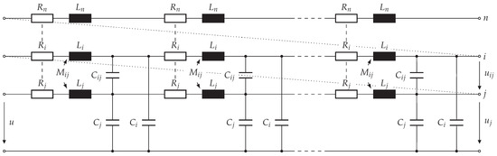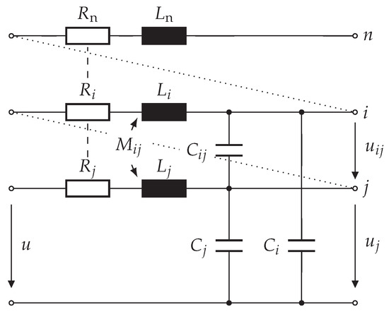 The representation is relatable to the multi-conductor transmission line model presented by C. R. Paul in [21] with the addition, that the end of a turn is the beginning of the next turn until all turns are considered. This turn-to-turn connection is illustrated by diagonal dotted lines, while vertical dashed lines represent the repetition of the single-turn model. The voltage is the voltage between the jth turn and the reference conductor, the voltage is the voltage between the ith and the jth turn, and the voltage u is the voltage applied between the model beginning (first turn) and the reference conductor.