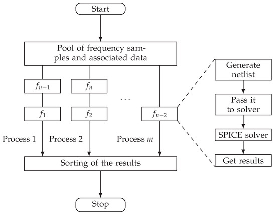 This is achieved by creating a pool, in which each frequency of interest is associated with its sample of the frequency-dependent data. Then, a number of m processes executes the given instruction asynchronously on the data given in the pool. The instructions are as follows: First, a SPICE-readable net-based netlist is generated, which contains all necessary information. Then, the netlist is passed to the SPICE solver, which, after successfully finding the solution, returns the result.
