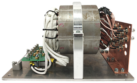 Electrical steel stator specimen S3 with three-phase winding and terminal board on the left side and inter-winding terminals on the right. This fixture’s base measurements are 300 mm by 230 mm.