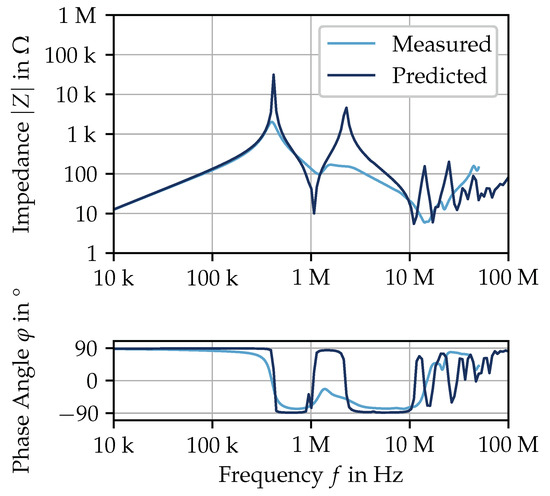 represents the relationship between the voltage at the electrical machine’s terminals and the voltage at the end of a turn or at the beginning of the next turn , (see Figure 6). Figure 11 shows the absolute value and the phase angle of the predicted and measured impedance.
