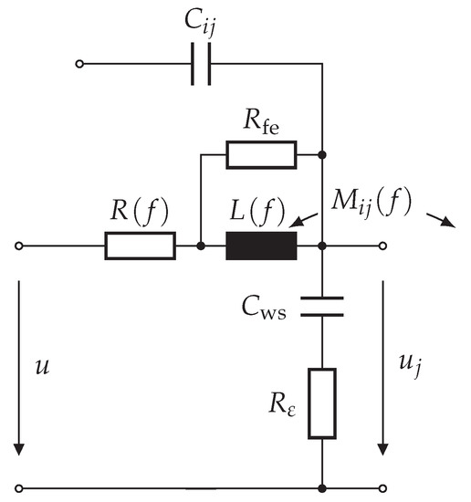Under certain conditions, a turn-based model is insufficient. This is especially the case, when the maximum frequency of interest is high and the electrical machine is large. Therefore, the single-turn model and subsequently the multi-turn model can be subdivided further into k circuits. Such subdivision is known from the approximation of distributed circuits and transmission lines [21]. An example is given in Figure 7, where the multi-turn model indicated in Figure 6 is subdivided into k circuits.
