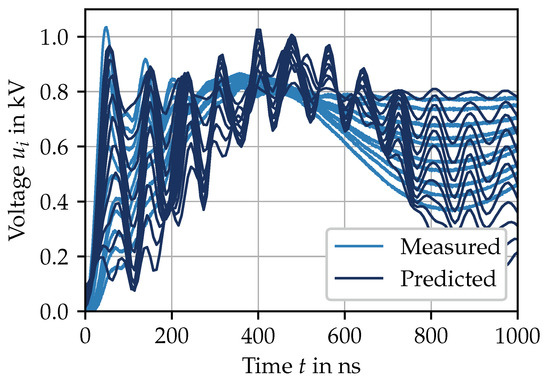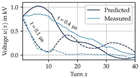 Prediction and measurement are slightly in line due the oscillations. The cause and effect of the oscillations were addressed before and improvements to the model were proposed. Figure 15 shows that the turn-to-ground voltage not only exceeds the dc-link voltage at the motor terminals but also inside the stator winding. The exceedance can be seen between position and at µs. Therefore, the insulation of certain turns is more stressed.