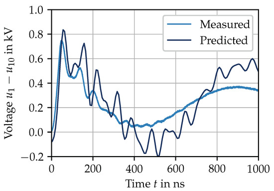 A solid agreement between measurement and prediction can be seen. The occurring oscillations also translate into the prediction of the voltage difference in a trending manner consistent with the measurement. The voltage difference between the first and the tenth turn reaches a level close to the dc-link voltage shortly after the voltage pulse is applied. The reasons for this are
