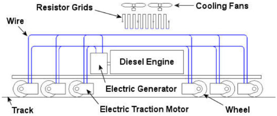 Usually, the brake energy is dissipated at the train’s roof in resistors, as shown in Figure 1. However, recent developments in energy storage devices have made energy storage a viable alternative in railway systems, especially in diesel–electric trains. The energy storage systems (ESSs) allow operation optimization and, therefore, maximize the regenerated brake energy. As a result, ESSs can improve energy efficiency by storing regenerated energy from conventional resistive braking [1].