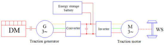 Regenerative braking charges the storage systems by converting the train’s kinetic energy into electrical energy. In the regenerative braking mode, the train’s engine slows down on an incline or when approaching a train station. The traction motor acts as a generator during braking and converts torque energy into electrical energy, as shown in Figure 2. As such, fuel consumption and emissions are reduced [7]. The application of this technique is not limited to diesel–electric trains. It also serves for kinetic energy recovery in electric and hybrid cars, electric railway vehicles, electric bicycles, electric elevators, and crane lifting motors. Moreover, it can be used in any industry that uses a conveyor system to move material from one workstation to another with halts at a certain distance after a prescribed interval [8].