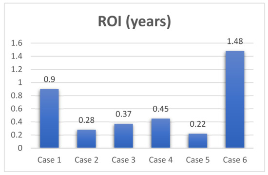 - Return on investment or restitution period (ROI—years). It represents the duration to recover the initial investment using the annual benefits (difference between the average annual revenues and expenses):