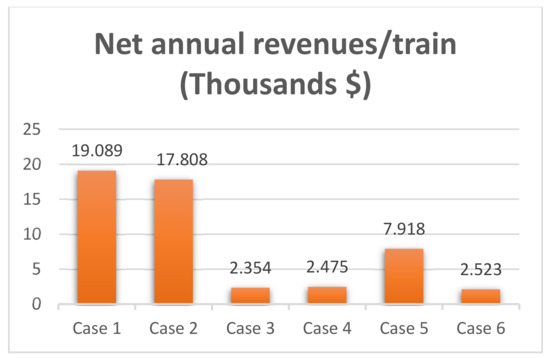 Comparison of net annual revenues/train (Thousands USD) for the six cases when using the electric brake regenerative technique.