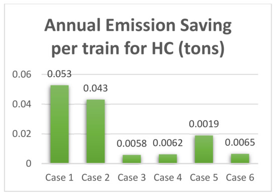 Comparison of annual emission saving per train for HC (tons) for the six cases when using the electric brake regenerative technique.