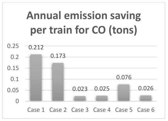 Comparison of annual emission saving per train for CO (tons) for the six cases when using the electric brake regenerative technique.