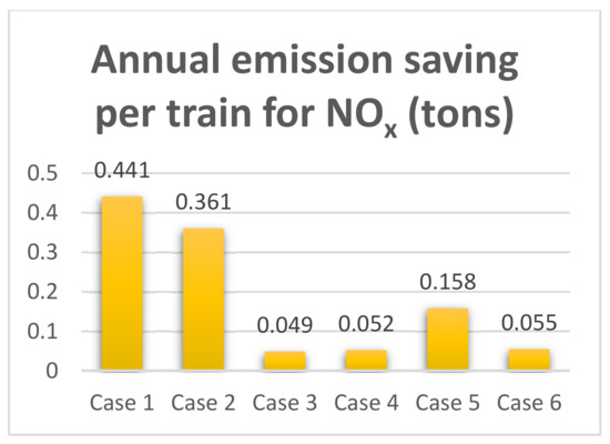 Comparison of annual emission saving per train for NOx (tons) for the six cases when using the electric brake regenerative technique.