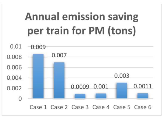 Comparison of annual emission saving per train for PM (tons) for the six cases when using the electric brake regenerative technique.