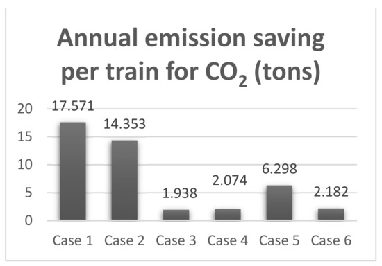 Comparison of annual emission saving per train for CO2 (tons) for the six cases when using the electric brake regenerative technique.