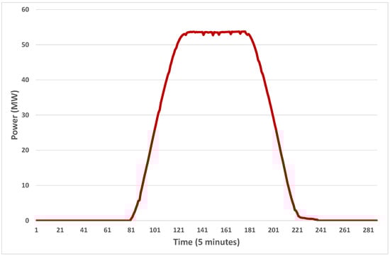 For solar farms in Australia, there is a feature that must be taken into account. In most situations, there is an oversizing of the field of panels, as compared to the capacity of the inverters. This is performed, we suppose, to make the output nearly constant for a number of hours on a clear day—see Figure 1 for a clear day at the Broken Hill solar farm, in western New South Wales.