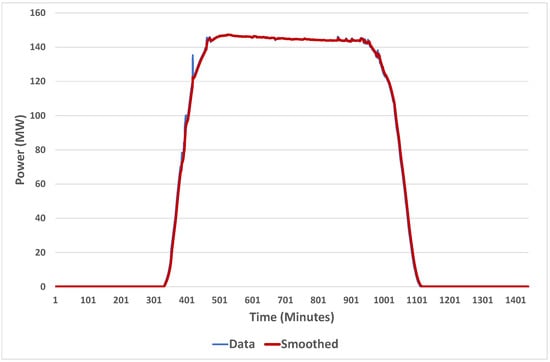 Note that the figure shows the profile for a clear day in summer. In winter on a clear day, the output will still reach the peak, but the time at the peak will be shorter on average, due to the sun being lower in the sky. So, as with clear sky model estimation for irradiance, we have to cater for seasonal variation if we are to define an empirical clear sky output (CSO) model for solar farms. Thus, the method we choose is to calculate the maximum value of the output for each time step of the day for the last thirty days. Then, we smooth these values using exponential smoothing. It could also be performed using a moving average. An illustration of this method is shown in Figure 2.