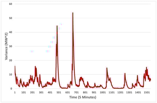We suggest another area that has not had enough attention is the change of variance over time and its autocorrelative nature. As explained in [,,], one has to cater for the change in variance in wind and solar, both resource and farm output, when performing probabilistic forecasting. An illustration of this effect is given in Figure 3, where we demonstrate how the variance over time using the exponentially weighted moving variance (EWMV) []. This is defined in the following way. First define the exponentially weighted moving average (EWMA).