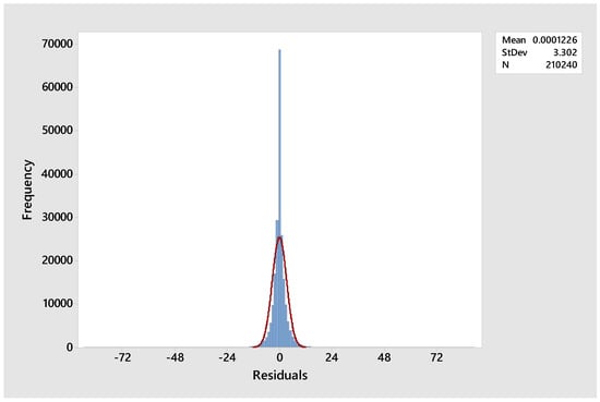 In these determinations, are in . It is obvious from the figure that an assumption of homogeneity of variance would be untenable. Further, if one examines the histogram of the noise terms after an autoregressive model is fitted to the output—see Figure 4—one can see that they do not follow a normal distribution and are an example of a fat tailed or leptokurtic distribution. So, in other words, the expectation that the noise will be white—independent and identically distributed—and also normally distributed, can not be justified. So, innovative means have to be employed to construct prediction intervals around a point forecast. In [], the noise terms are transformed to the standard normal distribution, and then a model for the changing variance was constructed. From that error bounds were determined using the forecasted standard deviation and the scores from the standard normal distribution—see Equation (7) for a prediction interval. are the upper and lower bounds, and s is the forecasted standard deviation. These bounds are then back transformed and added to the point forecast.