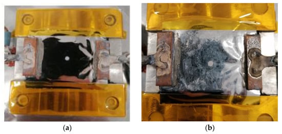 During the experimental test, particles got deposited in several parts of the tank. In particular, tank walls, heat resistance, and most of all, the tank base, which was included in the test surface. The deposition of nanoparticles will lead to a decrease in concentration, so the percentage increase that was previously estimated will actually be much lower due to this phenomenon. In fact, nanoparticle deposition will change not only the concentration but even more relevant aspects, which are the surface-related parameters, including wettability. The modification of surface appearance is visible after the experimental test, as shown in Figure 2.