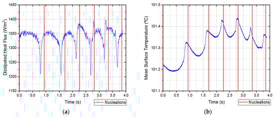 The temporal evolution of the dissipated heat flux and mean surface temperature for one video recorded with an imposed heat flux of 1290 W/m2 is depicted in Figure 3. The plots also include the instant when a bubble detaches from the surface, and consequently, a new nucleation beginning (red lines).