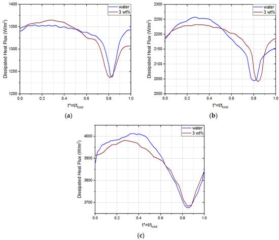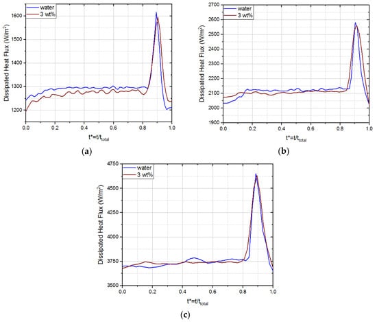 In order to analyze the heat transfer promoted by the formation of bubbles in the superhydrophobic region, the dissipated heat flux was evaluated for a nucleation time frame for different imposed fluxes. The obtained results for water and the nanofluid with the maximum concentration, as a function of dimensionless time, are shown in Figure 4. Examining the three graphs, it can be concluded that the dissipated heat flux curve was not altered when using nanofluids.