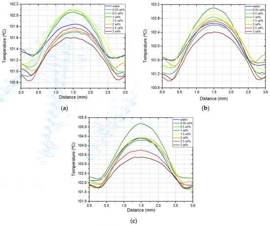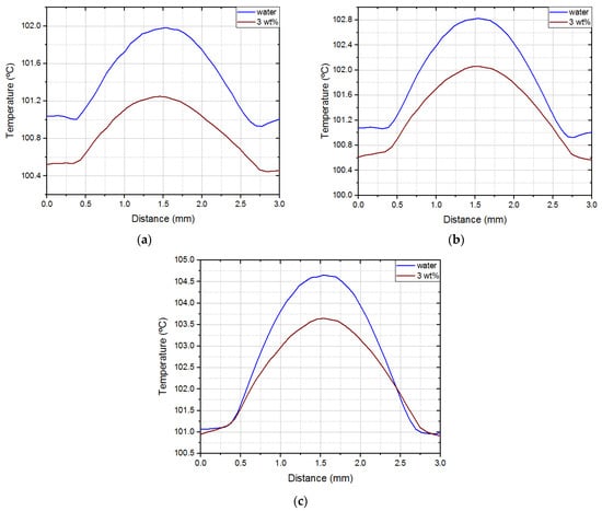 Averaging the temperature profiles of all nucleations along a horizontal line that goes over the center of the superhydrophobic region, with twice its diameter, it is possible to draw a mean temperature profile. This procedure was done for the imposed heat fluxes of 1290 W/m2, 2132 W/m2, and 3790 W/m2. Those temperature profiles are shown in Figure 5. The highest temperature occurs in the center of the superhydrophobic region, substantially decreasing in the hydrophilic region. All working fluids presented a similar behavior when rising the imposed heat flux. A substantial increment in temperature was observed in the center of the superhydrophobic region and not that significant in the hydrophilic region. This shows that heat dissipation is much more efficient in the hydrophilic region, given that the convective heat transfer coefficient of water in this region is much higher than the one of vapors inside the bubble.