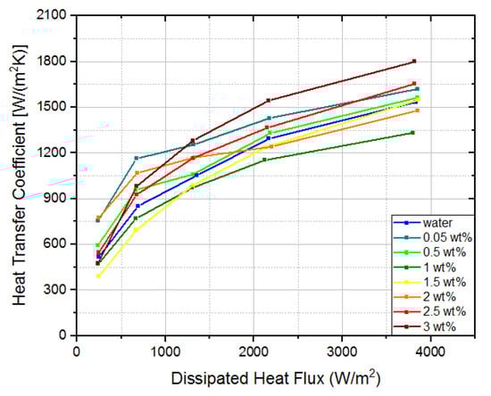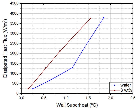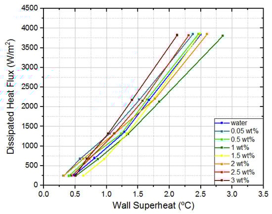 Looking at Figure 6, it can be easily concluded that nanofluids only mildly influenced the dissipated heat flux. Additionally, it could be verified that nanofluids do not significantly affect wall superheat. The largest variations occur at the highest dissipated heat flux for 1 wt% and 3 wt% concentration. In the first case, the wall superheat was 0.35 °C higher than water. In the second case, the wall superheat was 0.38 °C lower than water. This means that, for the same dissipated heat flux, the temperature in the interest region was 0.38 °C lower than for water, which represents a 15% decrease.