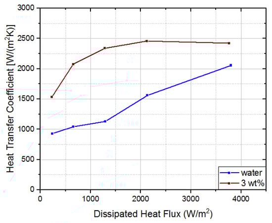 To assess boiling performance, it is important to analyze heat transfer coefficient variations. As illustrated in Figure 7, heat transfer coefficient increased progressively with heat flux increment as a result of higher bubble frequency. The worst case is for 1 wt% concentration, which exhibited a 202 W/(m2K) decrement in the heat transfer coefficient, compared with water. Hence, for the same imposed heat flux, higher temperatures are obtained. On the other hand, using a 3 wt% concentration was verified a 265 W/(m2K) heat transfer coefficient increment, which corresponds to a 17% increase. This shows a higher ability to dissipate heat; therefore, lower surface temperatures were reported (even though absolute temperature differences are small).