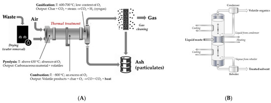 Schematic presentation of: (A) combustion, gasification, or pyrolysis processes; (B) column distillation of wastewater.