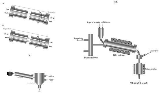 (A,B) Scheme of the co-current and counter current rotary kilns; (C) secondary chamber in thermal process; (D) schematic illustration of the French two-step calciner, plus hot crucible vitrification process.