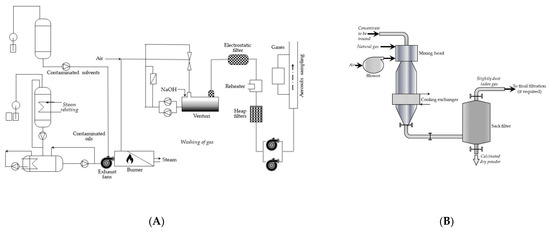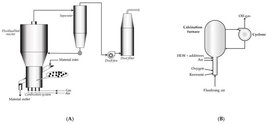 (A) The process diagram of incinerator Pierrelatte (COGEMA) (adapted from Ref. [26]); (B) simplified scheme of the COGEMA calciner skeleton (adapted from Ref. [26]).